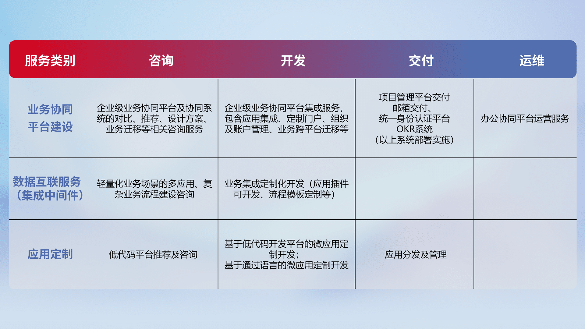 针对钉钉、、、、企微、、、IDaas等平台级产品提供产品的规划、、、方案、、、交付、、、定制化开发等服务,,实现如统一协同办公、、智能客户服务、、、、混合会议管理、、、、智能数据查询、、等业务场景,,实现数字化转型。。